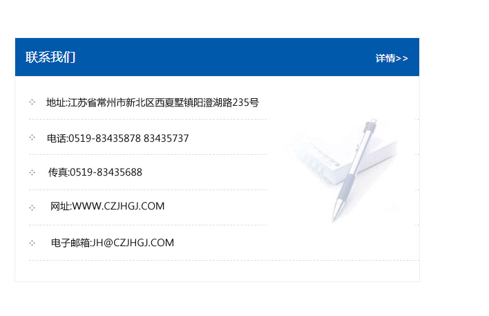 地址:常州市新北區友邦商務大廈1幢16、17層  電話:0519-85101652  傳真:0519-85112595  郵編:213022  網址:www.cz-jiayue_cn.10shifang.com  郵箱:xiajifengaa@163.com